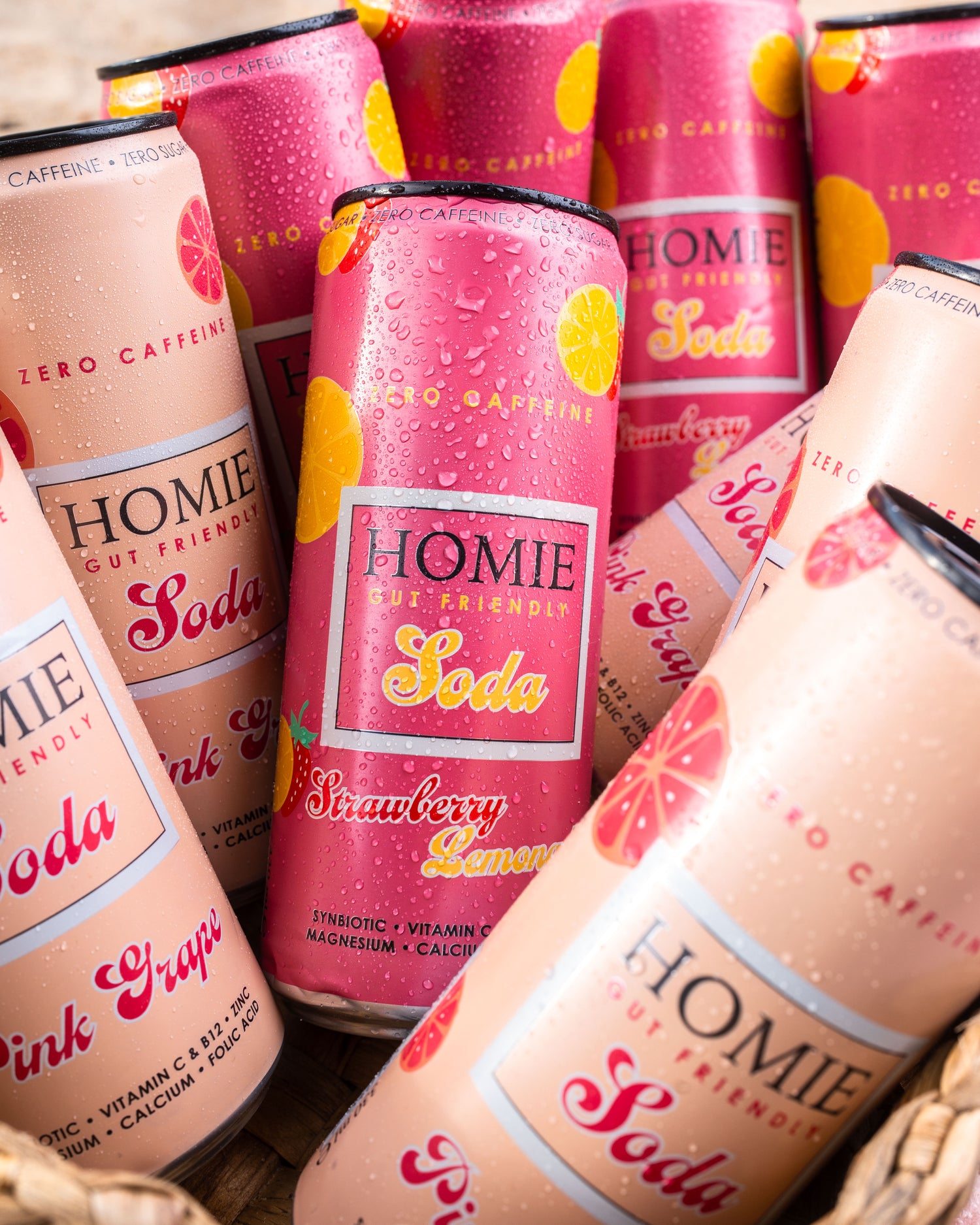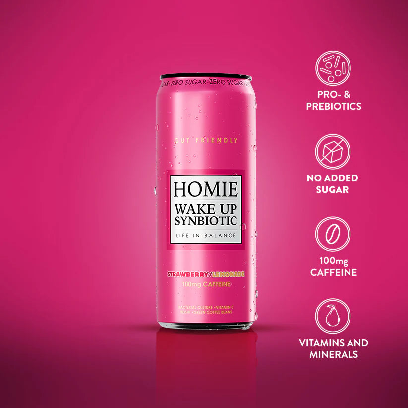 is a carbonated drink with caffeine, live bacterial culture, reishi, chicory root and selected vitamins and minerals. With strawberry and lemonade flavors.